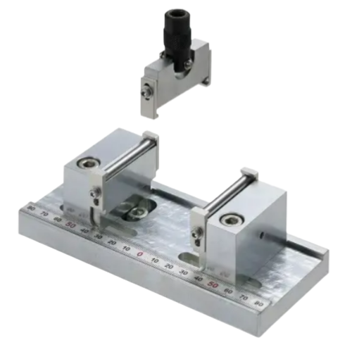 A 3-point bending test fixture designed for accurate testing of flexural, rigid, and semi-rigid materials. It features interchangeable loading pins, easy width adjustment with a built-in scale, and compliance with ISO and JIS standards.