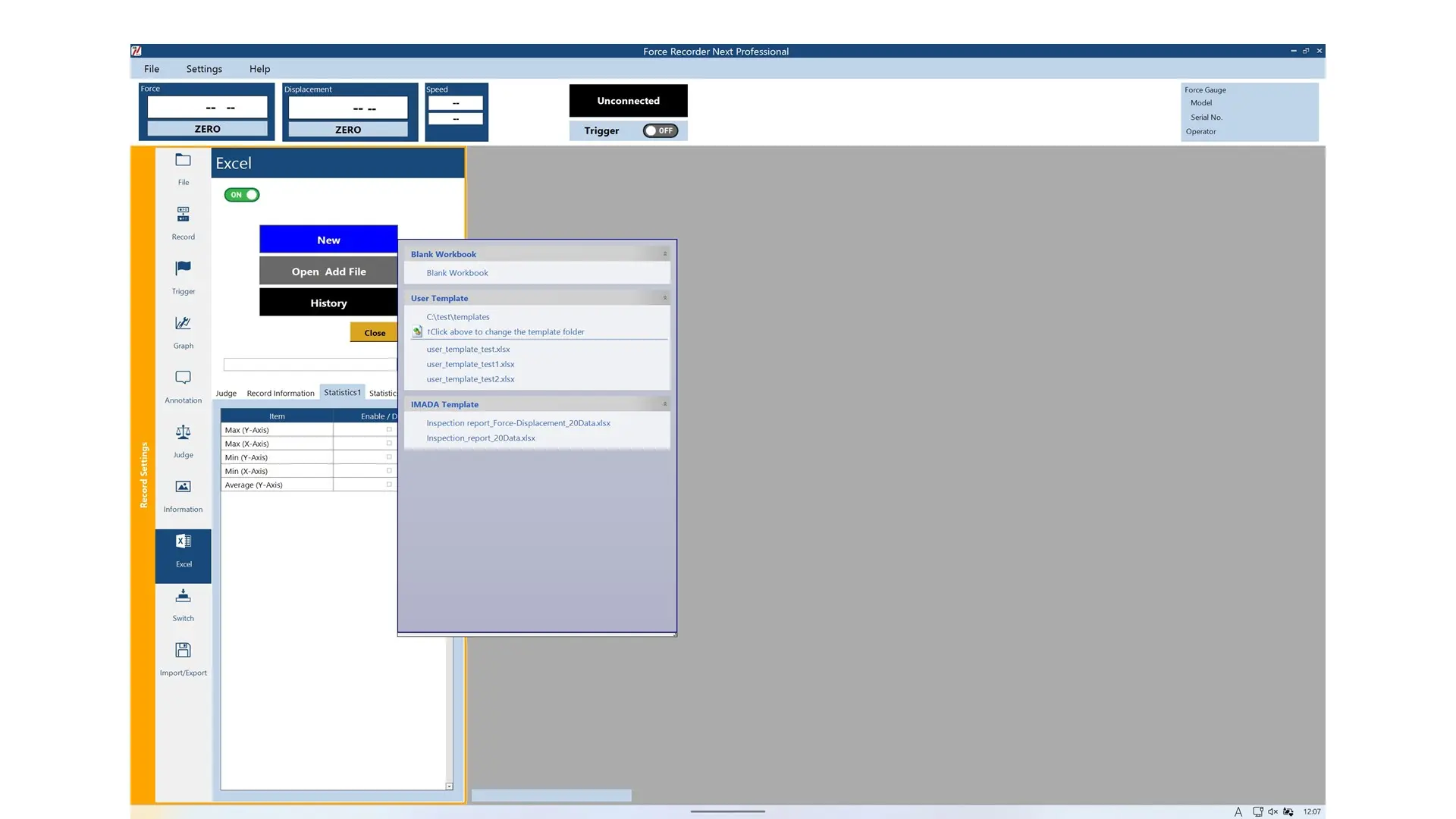 The Excel Data Writing Function is a plug-in for the Force Recorder Next Series and can be used together with other plug-ins. It automatically transfers measurement data, including statistical results, into Excel files (.xlsx and .xlsm formats). Along with support for user-created formats, the plug-in provides built-in inspection report templates, enabling efficient and customized report generation. By automating data entry, it helps streamline operations and minimizes the risk of transcription errors. *Download Card Basic is required.