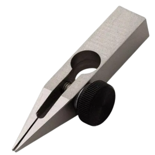 A fine point chuck for tension testing of delicate samples such as fibers and hair in confined spaces. It features a compact, low-capacity design and is available in stainless steel (FP-50) and lightweight aluminum (FP-51) versions.